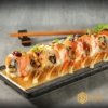 SALMON MAYO, CUCUMBER, TOPPED WITH ASSORTED SASHIMI, AVOCADO, AND FLYING FISH ROE